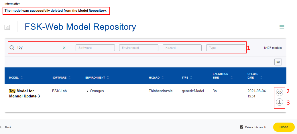 The tabular view of the FSK-Web model repository provides the option to search and filter for models of interest (1), to view the model details (2) and to download models (3).