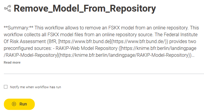 After login to the FSK-Web Protected Area you will have access to the service for removing a FSKX compliant model from the model repository by using the workflow Remove_Model_From_Repository.